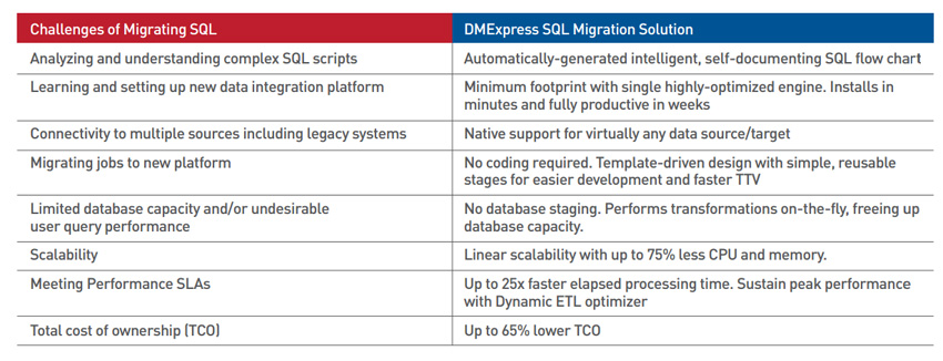 Cost Effective. Growing data volumes, along with the increasing velocity and variety of sources, are pushing the limits of home-grown data integration solutions. The resulting complexity and increased costs have made developing, maintaining, and tuning thousands of SQL scripts unproductive and unsustainable. The DMExpress SQL Migration solution can help organizations regain control of their data integration processes by bringing all data transformations into purpose-built, high-performance, self-tuning data integration software.
